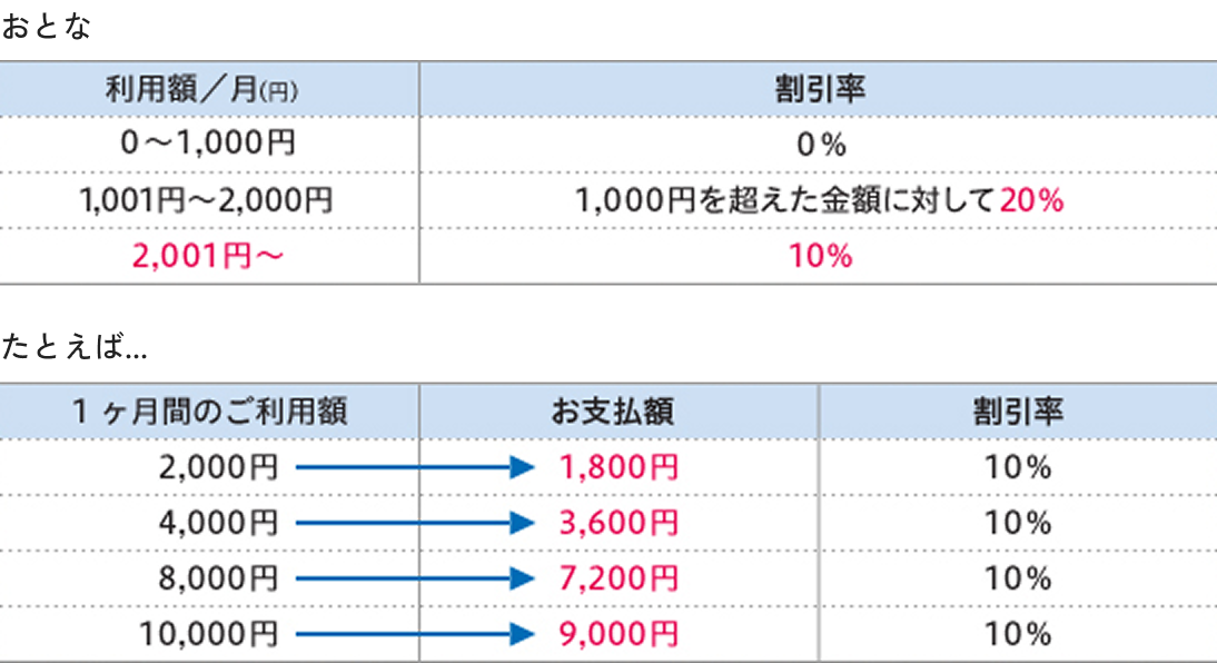 上限額に達しない場合は利用額割引が適用されるため、ご利用が多い月も少ない月もずっとおトクになります!