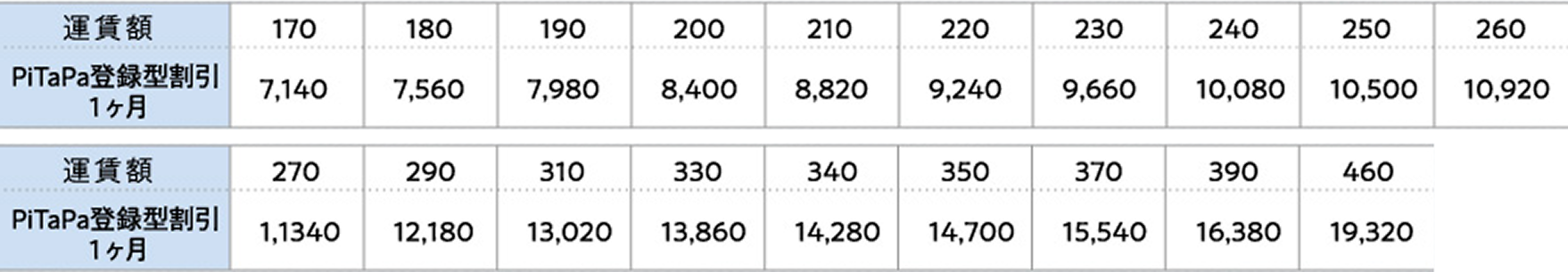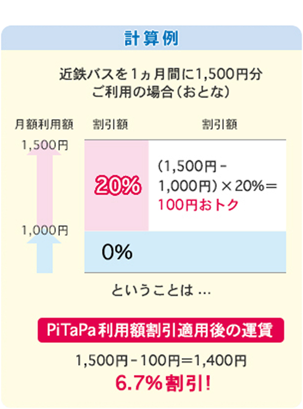 1ヵ月間(1日~末日)のPiTaPaでの近鉄バスご乗車分の運賃合計額に応じて、自動的に割引が適用となります。