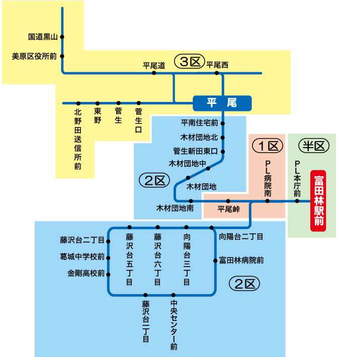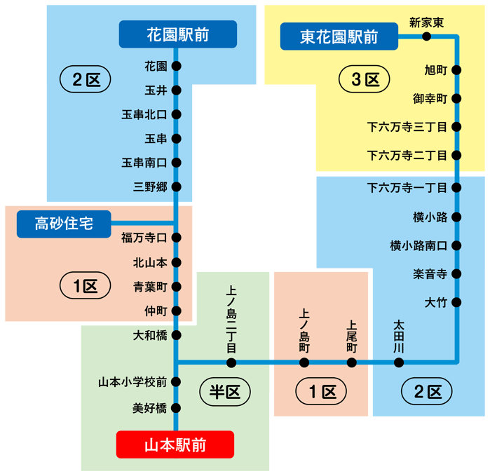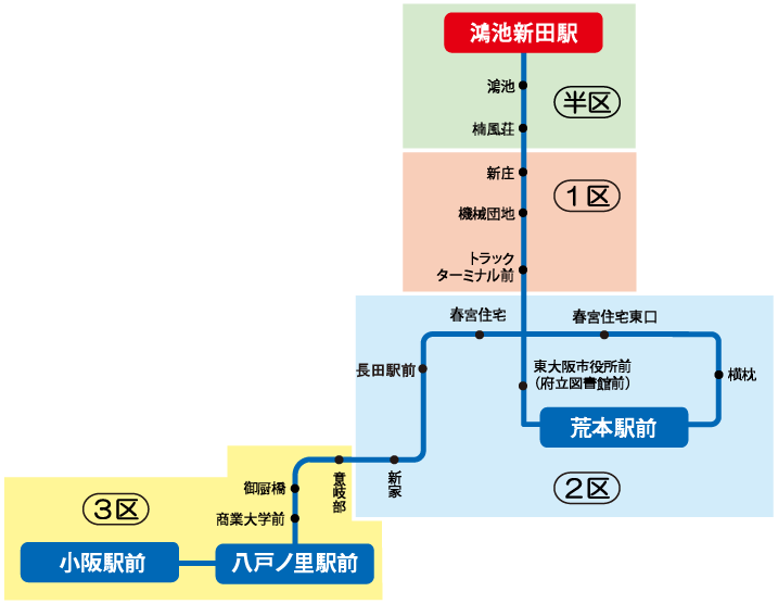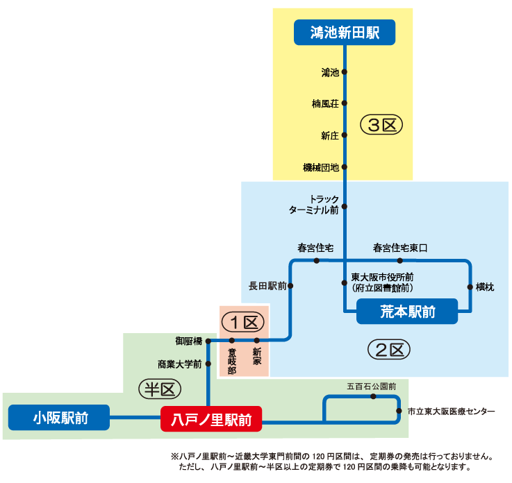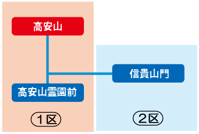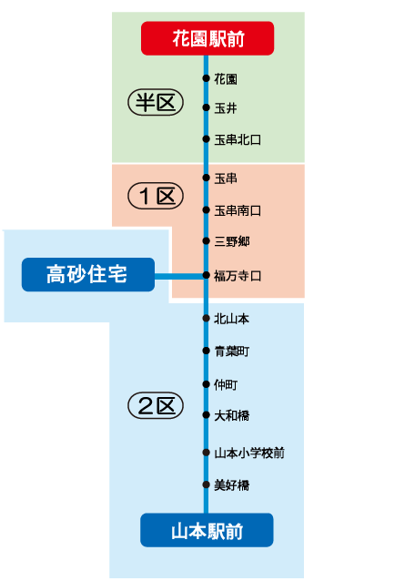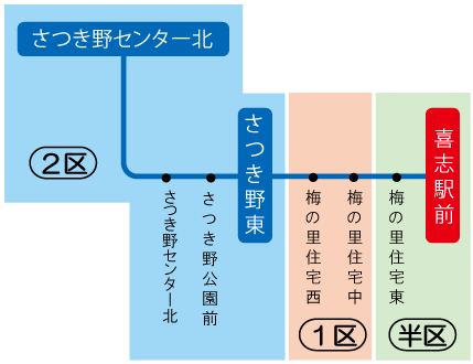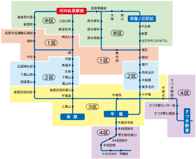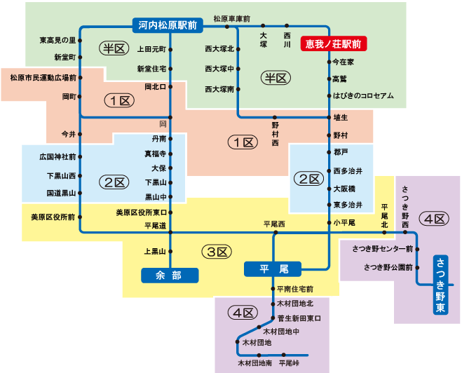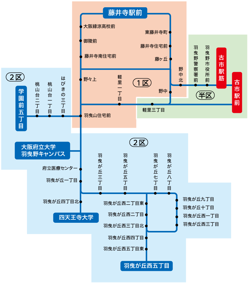 「藤井寺駅~2区 」の定期券をお持ちの場合、藤井寺ゾーンの2区までの範囲で自由に乗り降りが可能です。