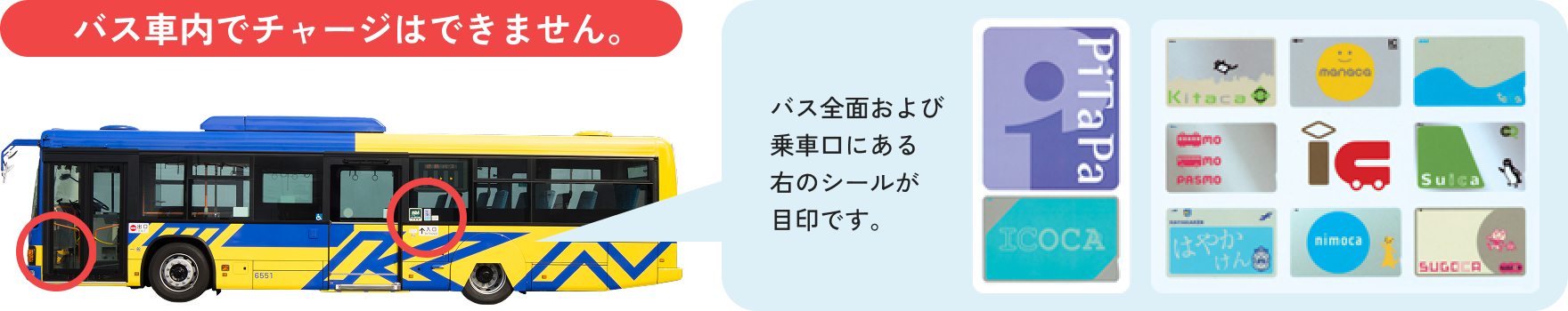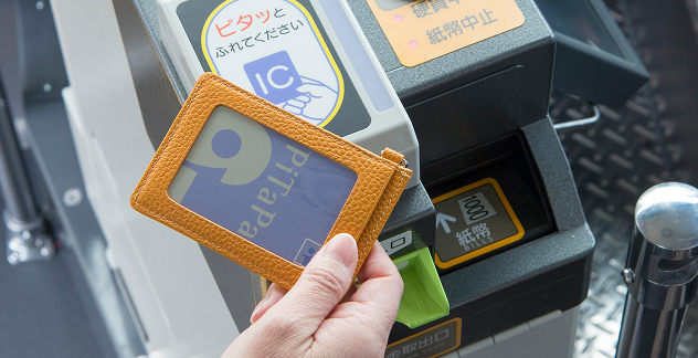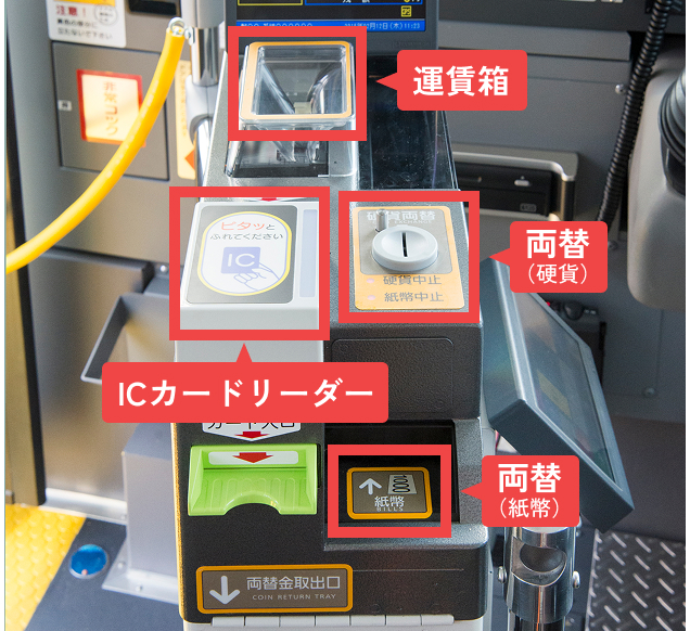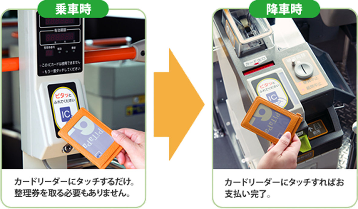乗るときに、乗り口横にあるICカードリーダーに、