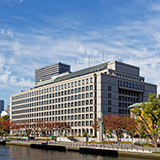 - 中之島エリアの御堂筋沿いに位置。現在の庁舎は1985年建築のものですが、南ロビーには1921年に建設された旧庁舎の玄関部にあたるルネサンス様式の装飾が残っています。