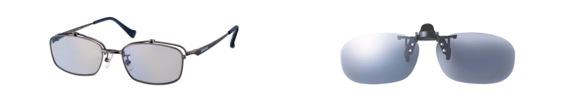 ※左:フリップアップ(跳ね上げ式タイプ) 右:クリップオン(メガネの上に着用するタイプ)