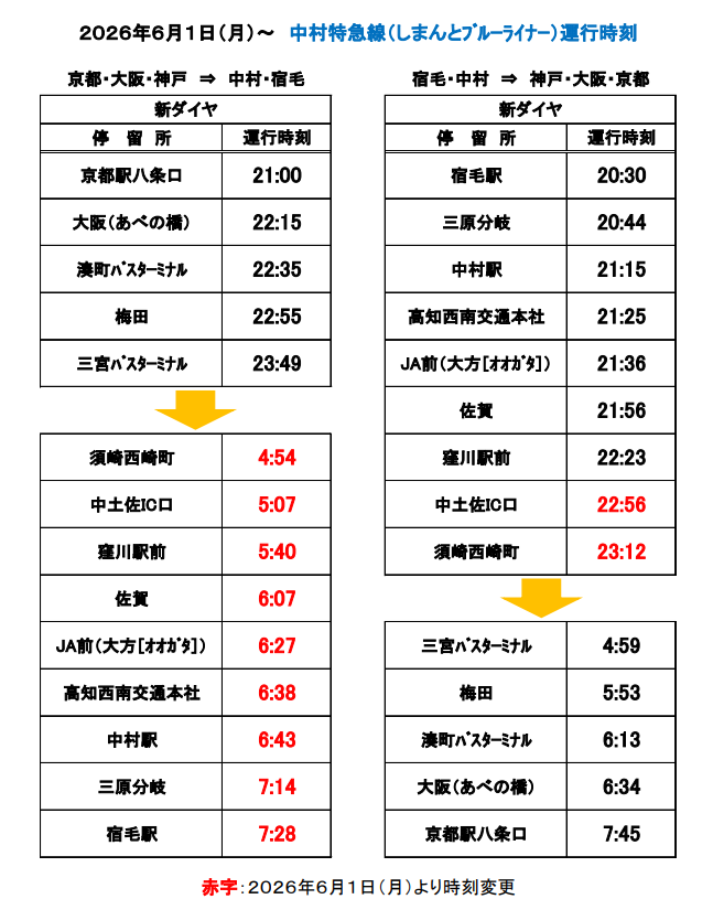 2026年6月1日(月)から、中村特急線(京都・大阪・神戸~中村・宿毛)の運行時刻を一部変更いたします。