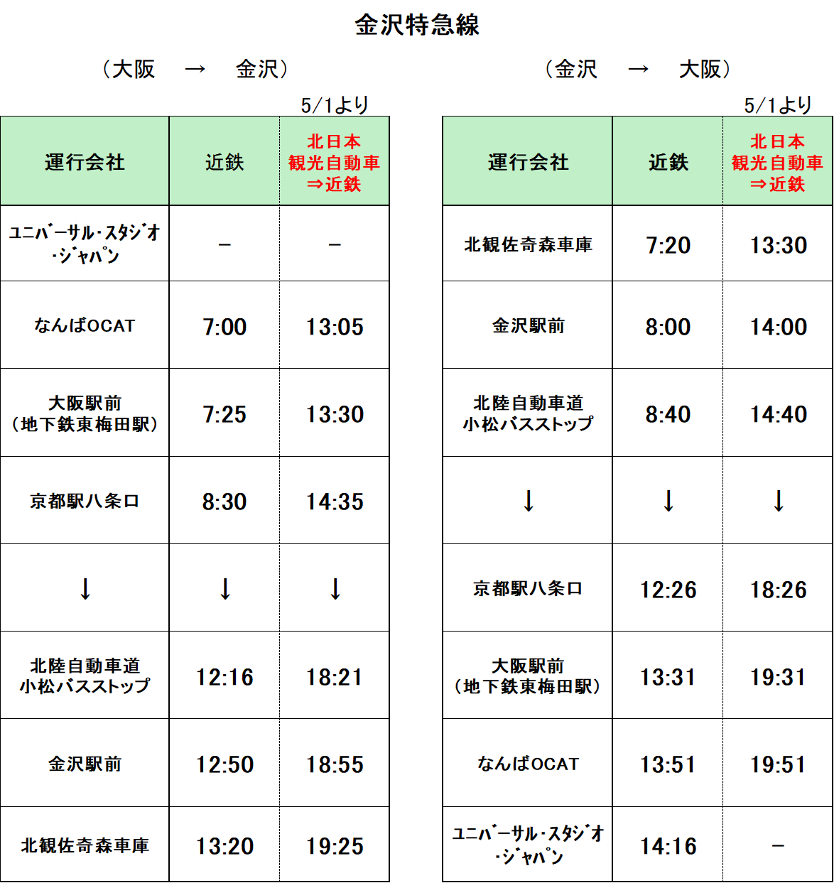 ※5月1日(金)は、大阪発便のみ2便運行し、金沢発便は朝便のみの運行とします。