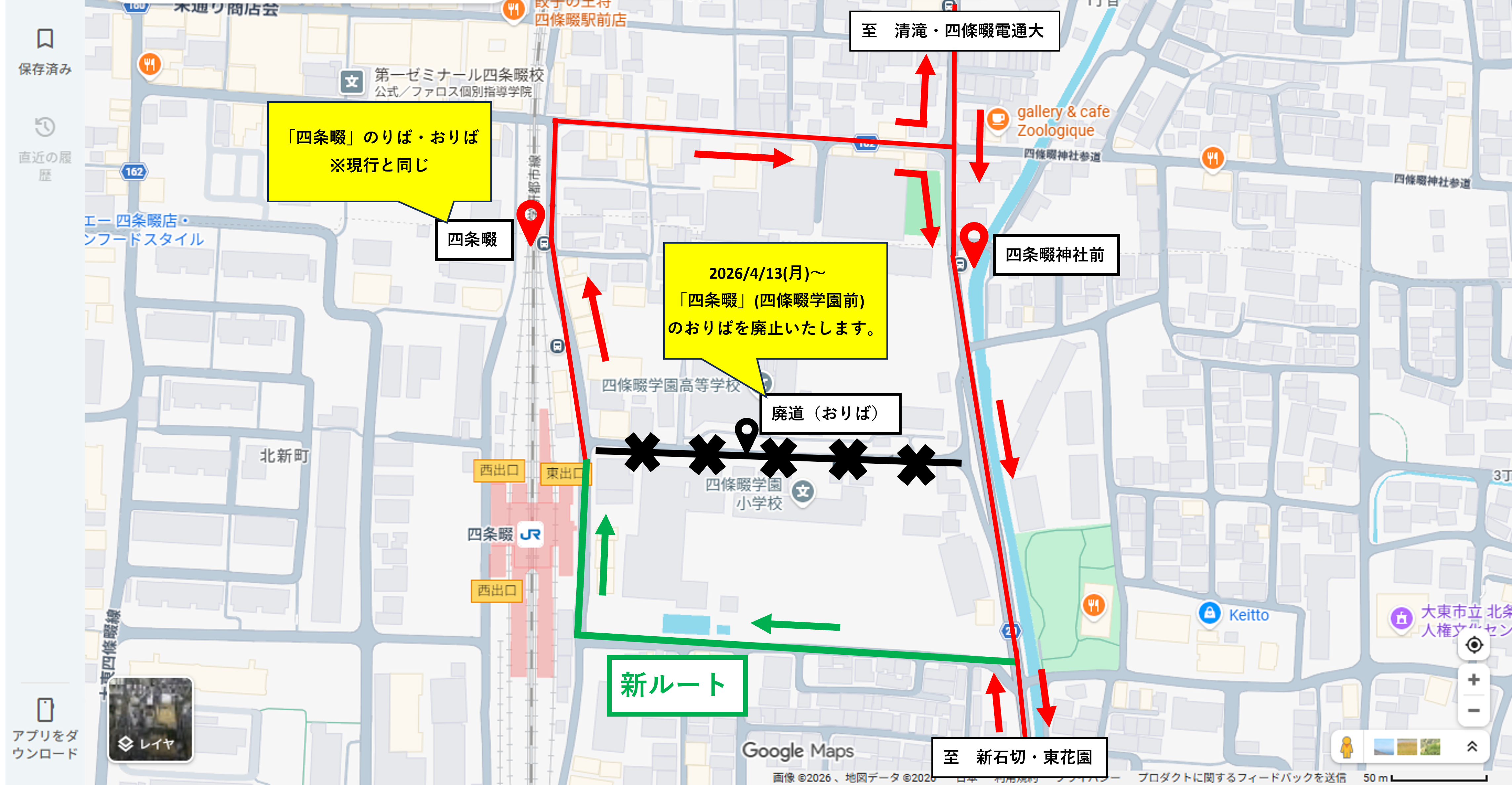 2026年4月13日(月)より運行経路を一部変更し、「四条畷」停留所(四條畷学園前バスおりば)を廃止いたします。